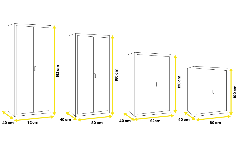 En Taquimetal disponemos de este modelo en 4 alturas: 100, 120, 180 y 192 cm. Los armarios más bajos cuentan con 2 baldas metálicas y los armarios altos con 4 baldas.