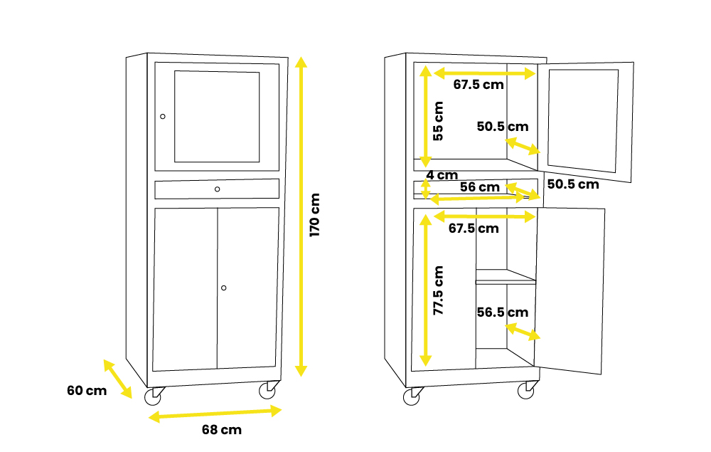 Armario fabricado en acero en con acabado en pintura epoxi anticorrosiva de 0,8 mm de grosor, posee 4 ruedas multidireccionales que permiten al usuario el desplazamiento y movimiento libre de un lugar a otro.