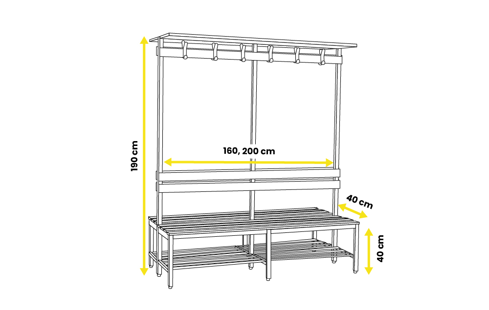 Los bancos de vestuario doble con perchero están compuestos por un asiento con respaldo en composite, percheros para colgar ropa, repisa inferior y una repisa superior. Cuentan con una estructura metálica gris con acabado en pintura epoxi resistente a golpes y a la corrosión. Resistentes, hidrófugos y duraderos.