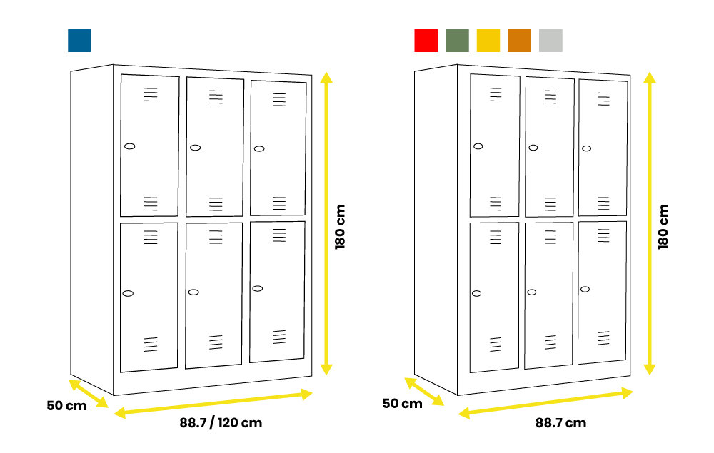 Estas taquillas dobles está disponible con un ancho de 90 o 120 cm en diferentes colores: